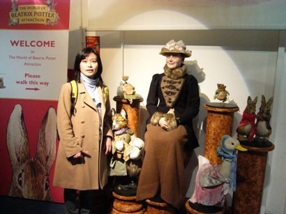 一進門,先以影片介紹彼得兔作者碧翠絲.波特,然後藉著這個引子,慢慢走進她的童話,和她的動物世界裡。這裡果然是彼得兔的”大本部”!連咖啡屋都打著彼得兔的招牌呢,吸引了大大小小、各個不同年齡層的觀光客,到此一遊,也包括我這種愛作夢、嚮往童話世界的媽媽在內。