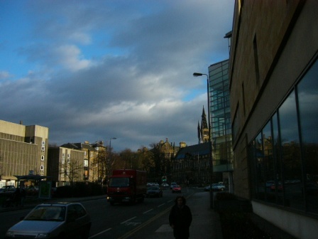 蘇格蘭的天空,時而烏雲密布,時而晴空萬里,圖為Glasgow大學區