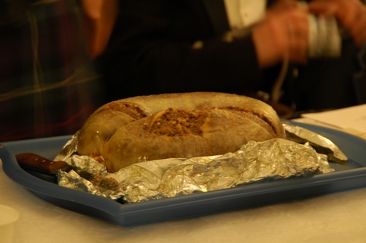 在切哈吉士之前,後有一小段儀式,朗誦著羅勃‧奔斯(即蘇格蘭最偉大的詩人,他蒐集並保存了蘇格蘭很多重要的詩歌) 的詩,然後由一位帶著廚師帽的先生負責切哈吉士,聽他念念有詞(當時英文太差,實在聽不出來他在念什麼),簡單的吟唱儀式結束後,一刀切入哈吉士,再分裝成小塊,分給在座的每一個人。