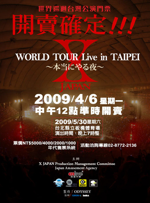 日本傳奇搖滾天團X-JAPAN,從去年團長YOSHIKI到101大樓點燈,宣佈其世界巡迴演唱會將於今年二月十四日來臺開唱,幾經YOSHIKI身體不適、貝斯手HEATH與經紀公司的合約糾紛、三月底韓國兩天演唱會緊急停擺、臺灣場延期、歌迷齊穿婚紗抗議、主唱TOSHI遭控詐財出庭、LUNA SEA吉他手SUGIZO五月初宣佈加入等一連串的風波,五月三十日終於在臺北縣立板橋體育場盛大舉行。兩萬歌迷自入場第一秒起,便迫不及待地紛以螢光棒和雙手交叉成「X」字樣,大喊「We are X」,並自主玩起波浪舞,晚間七點,檔期一延再延的「勢在必行」演唱會居然準時開唱,第一首〈Rusty Nail〉即讓全場歌迷陷入亢奮與瘋狂,〈Say Anything〉的懷念HIDE橋段、〈Art of Life〉的連續攻擊、〈ENDLESS RAIN〉的大合唱、YOSHIKI中場華麗而激烈的鼓solo,以及〈X〉時所有人交叉雙臂齊呼跳躍的「X-JUMP」、TOSHI牽著身穿婚紗且滿臉嬌羞的YOSHIKI滿場飛奔、超大型充氣HELLO-KITTY從舞臺兩側升起等,十四段演出、全長超過三個小時的吶喊解放,臺上、臺下陷入完全暴走的狀態。