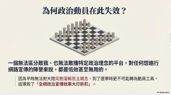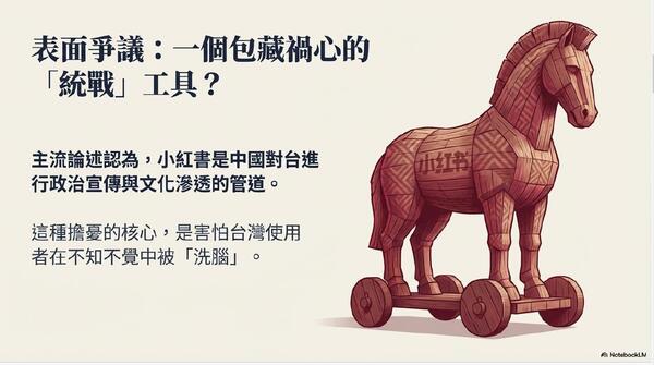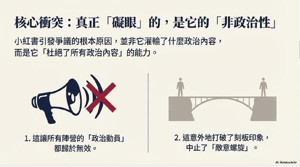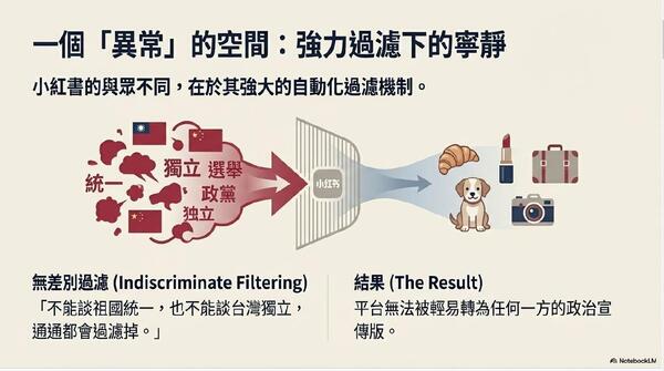 還記得大罷免時,各種非政治的群組,版面都偷渡各種政治文,甚至有人聲稱人民參政權中和選舉並列的罷免不是政治活動是公民活動,台灣很多非政治群組版面到了選舉都可以立即轉換為政治板,而一談到政治,平時理性的群友可能都會失去理性相互攻訐使討論偏離設版宗旨,而多數論壇並沒有AI功能自動移除所有偷渡的政治文,必須仰賴版主人工刪除,非主流的群友如果想讓版面回歸功能,通常就只能息事寧人,任由主流群友宣傳政治理念,偏偏小紅書有那種強大的過濾機制,不能談祖國統一,也不能談台灣獨立,通通都會過濾掉,平時不能對大陸同胞灌輸民主概念,到了選舉時更不能轉為政治板,導致全網政治宣傳效果大打折扣,難怪小紅書如此礙眼?