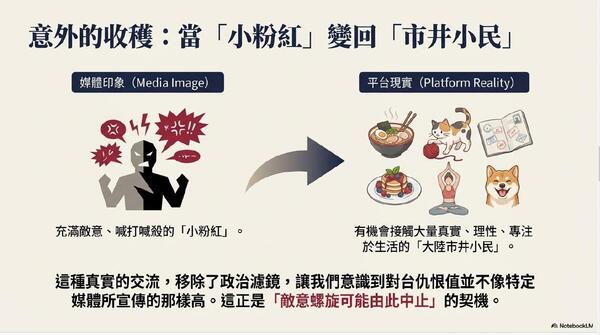 另一方面,小紅書讓台灣民眾有機會接觸大陸大量真正市井小民,而非新聞上那些喊打喊殺憤世嫉俗的小粉紅,也非特殊權限翻牆出來的特定團體人士,讓台灣民眾發現有些團體利用歷史上種族仇殺與奴役的各種史實來塑造亡國奴的下場,不一定會發生在兩岸戰爭?畢竟只比二戰日本在南京大屠殺後稍晚的國共戰爭,似乎也沒發生共產黨對整個城市平民無差別屠殺的事件?小紅書讓大家意識只要不談政治,大陸多的是理性民眾,對台仇恨值不像特定媒體宣傳?敵意螺旋可能由此中止,而小紅書不談政治,無從知道使用者的政治傾向,自然也無法針對特定政治傾向的使用者去進行追蹤監控,或有人擔心特定時機小紅書可能被轉為對岸政治宣傳用,其實我國民眾多數對政治都很有警覺性,一旦小紅書政治化,大家的心防馬上升高,應該會自然棄用小紅書,除非有人輕視了台灣民眾的智慧