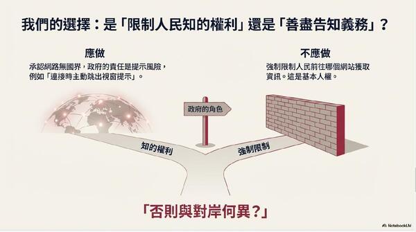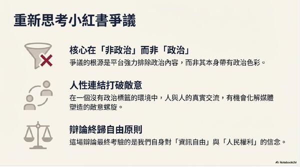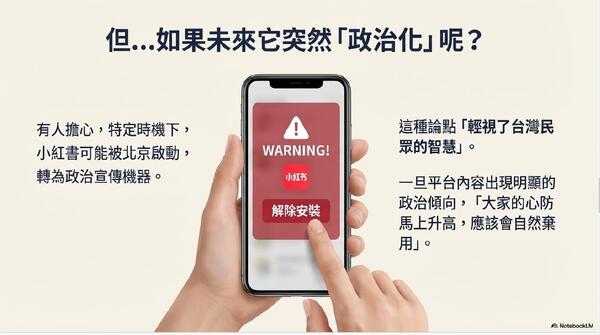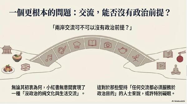 兩岸交流可不可以沒有政治前提?小紅書實現了沒政治的純文化與生活交流,但對於想利用政府治權延伸到網路,以達強迫對岸協議承認其獨立存在的政治前提的特定陣營人士來說或許特別礙眼?民主體制下的人民高興到哪個外國網站去獲取資訊難道不是基本人權與民權?政府憑什麼強制限制不得前往?有風險可以善盡告知義務,比方說連接時主動跳出視窗提示風險,人民可接受風險的話就不該限制人民知的權利,否則與對岸何異?對岸只要不談政治也是都可暢談,無限文化創意在各種陸劇發揮淋漓盡致
