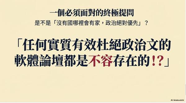 試問台灣目前是否有其他類似小紅書的軟體或論壇,會自動濾除所有政治文,讓各種版面討論回歸創版意旨,又或者沒有國哪裡會有家,政治絕對優先,任何實質有效杜絕政治文的軟體論壇都是不容存在的!?