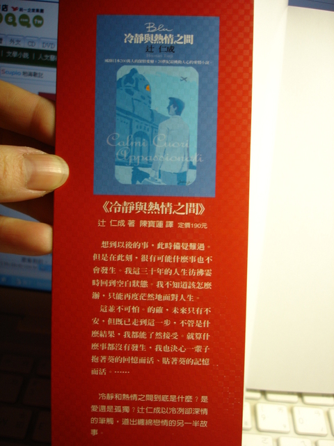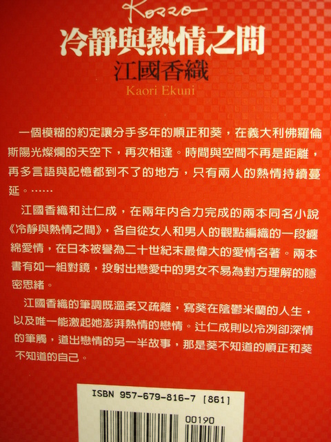 要閱讀這本作品的朋友,當你購買了這本「江國香織~冷靜與熱情之間(紅)」之後,請你也順手把「辻仁成~冷靜與熱情之間(藍) 」一起買下,因為這是兩位大作家的聯合創作,並且這次的合作獲得了相當高的評價,因此之後他們又共同書寫了《在愛與戀之間》這一本書(不過我尚未閱讀這《在愛與戀之間》,我是一定會看的)。