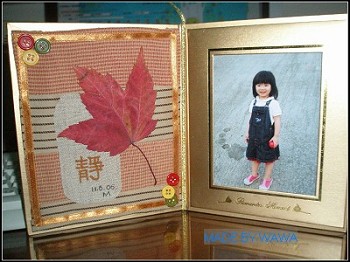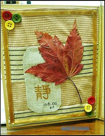 看看葉子,比日本的楓來得大,比手掌還大,她一定是用心選過的,在大地上,穿著她的高跟鞋,一葉一葉的選著!MIKI還有些結婚時發送未完的紙質相框,金色,厚實,剛好可以利用,於是,選布,裁布,組合、拼湊出MIKI對於秋天的想念,寫上【靜】,送給遙遠的妳,一同分享秋天的顏色!