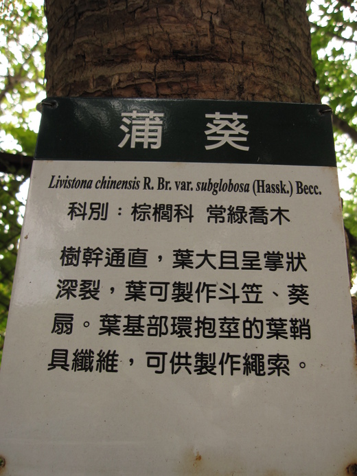 某日下午到虎頭山閒晃,在停車場看見奇特的植物。樹幹長得又高又直,葉子也是超級大,像一把有趣的設計傘。碰上我這位植物迷,當然得拍照記錄一下,先拍這棵掛著名牌的樹,哦!原來是蒲葵。