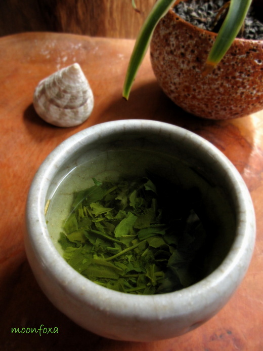 在小小的茶碗中,用溫溫的水浸泡著些許的煎茶,