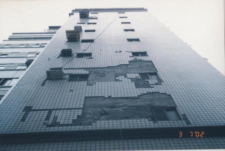 八年前的這棟大樓疑似經過地震後,西面的外牆嚴重損壞、磁磚及粉飾層膨凸爆裂。其他區域卻大致良好,可以確定肇因為當初施工不良。