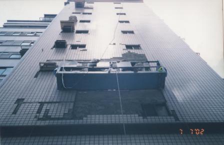 外牆修繕:外牆瓷磚崩落、外牆瓷磚修補、外牆泥作工程,外牆修復~免搭鷹架,合格安全吊籠施工。2002.1台北城中