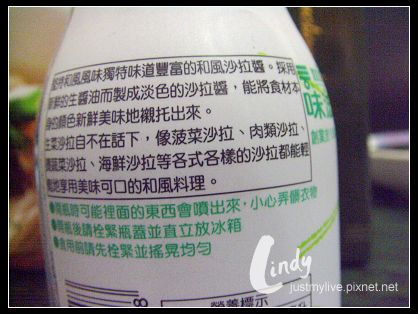 本來我是有想說我弟好像還蠻愛吃沙拉的,要叫他下次去摳斯扣買沙拉吃的話,配配看這個醬看好不好吃,還有就是叫他幫我想想除了問沙拉以外,還可以搞什麼名堂來試試?可是他也沒有什麼好的創意吃法。