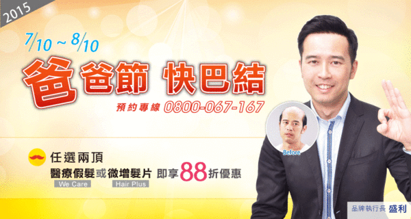 父親節快到了,哪種禮物可以讓爸爸既年輕又保有健康呢!當然就是假髮!! 7/10(五)到8/10(一)來魔髮部屋全台16家門市,選購Hair plus(微增髮片)或We Care(醫療級假髮)任兩件就有88折優惠,趕緊來選購,讓爸爸重現年輕帥氣的形象。