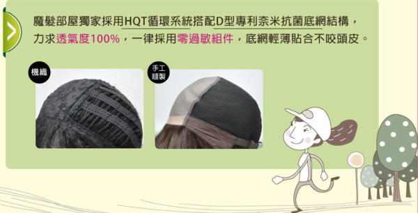另外底網經由二代奈米光觸媒處理,達到抗菌、抗垢、抗異味的三大功能,更能符合長時間配戴的需求,不過初期配戴假髮還是像配戴隱形眼鏡一樣,建議您有個適應期,循序漸進慢慢增加配戴時間喔。