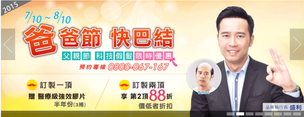 父親節即將到來,親愛的爸爸身體上的健康和心情上的愉悅,都是孝順的兒女責任。有掉髮、頂部掉髮、頭頂稀疏、白髮的爸爸福利來了!魔髮部屋今年度父親節特推出88節快巴結爸爸專案,讓父親即刻變年輕,只要3秒微增髮片立即修飾需求部位,讓您輕鬆擁有年輕髮型,重現過去帥氣英姿!或是長期染髮讓你的頭皮健康出現警訊,髮量越來越細少,魔髮部屋醫療級假髮擁有ISO雙認證,健康重現自信髮型,30年專業師傅純手工鈎織,生動髮流、根根立體分明,逼真自然就像自己的頭髮。即日起至8/10來魔髮部屋選購微增髮片或醫療級假髮任選購兩件則享有88折優惠,快來幫爸爸顧健康又年輕。