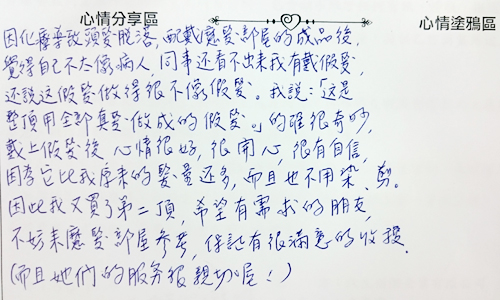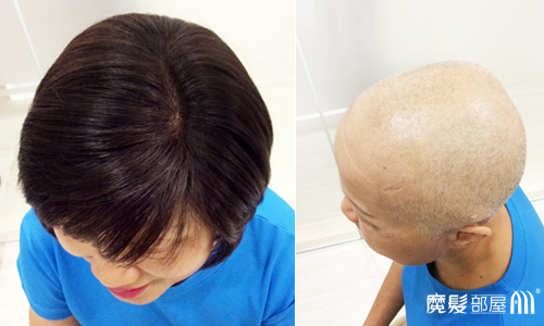 因為化療導致頭髮脫落,配戴魔髮部屋的成品後,覺得自己不太像病人