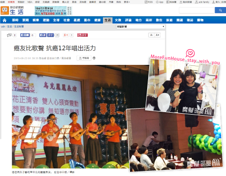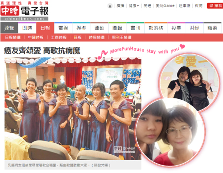 還有一群由乳癌病友一起組成「愛呦愛唱歌合唱團」,現場演唱齊豫、潘越雲合唱的「夢田」,她們說:「我們是一群被老天在身上劃上記號的好姊妹,在抗癌路上藉由歌聲鼓勵大家正面思考心中的那畝田。」