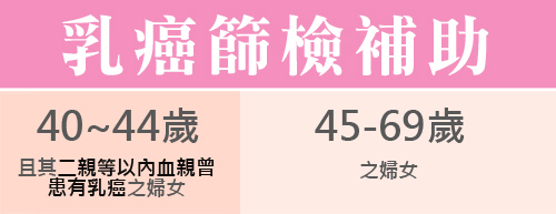 除了自我檢測之外,搭配定期的乳房攝影檢查也是很重要的!畢竟乳癌初期的微鈣化點太小,徒手檢查很難摸出來,政府補助45以上未滿70歲婦女,及40歲以上至未滿45歲且其二親等以內血親,曾患有乳癌之婦女每2年1次乳房x光攝影篩檢,只要帶著健保卡到有提供乳房X光攝影醫療機構檢查就可以了!