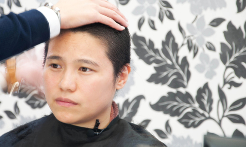 動刀前我們再三確認,她溫柔而篤定的眼神令人心生敬佩,剃刀一道道的收割著她的頭髮,圓潤漂亮的頭型逐一展露出來