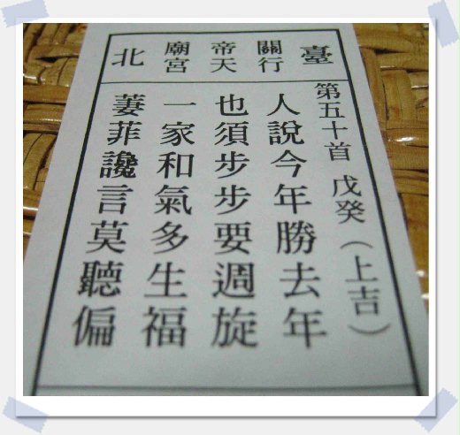 好不容易在經過了N次重抽重擲後,終於是得到了那三杯聖杯的第五十首籤,興高采烈的跑去找解籤阿杯,他既然說我沒有確實的地址,所以無法解籤。.............................
