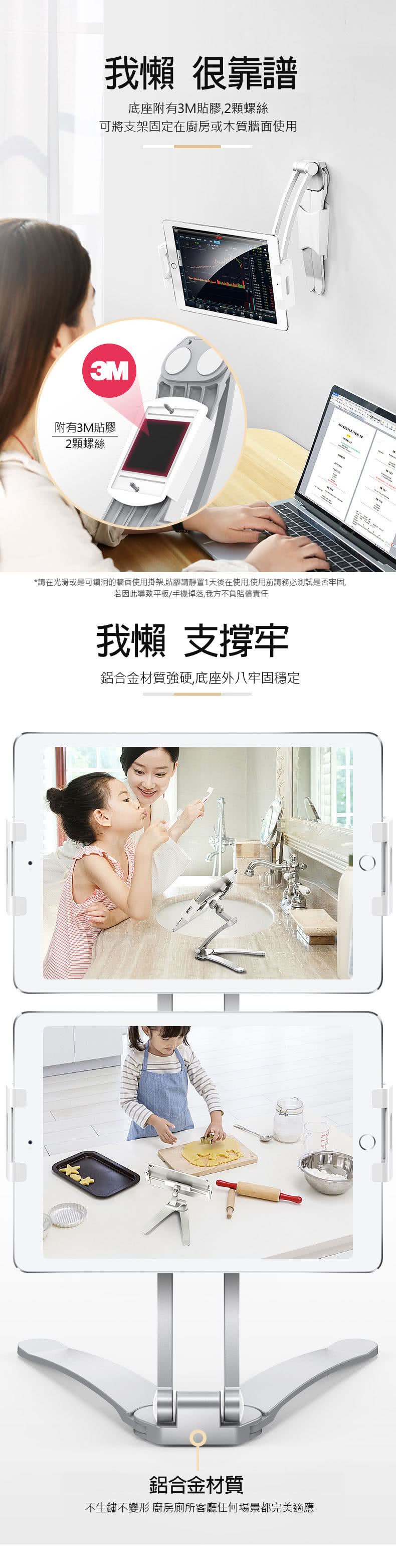 ※請在光滑或是可鑽洞的牆面使用掛架,貼膠請靜置1天後在使用,使用前請務必測試是否牢固,若因此導致平板/手機掉落,我方不負賠償責任