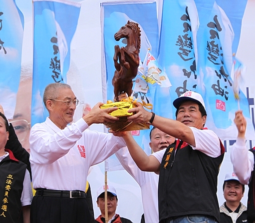 造勢大會並由副總總候選人吳敦義頒授【馬到成功】木雕馬予板橋競選總部,象徴馬吳競選連任成功。