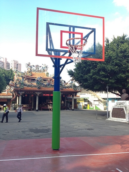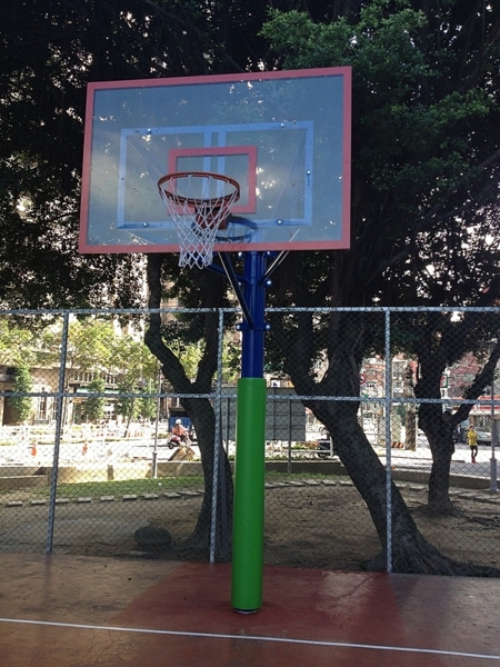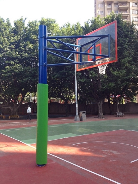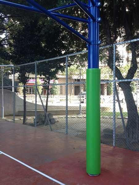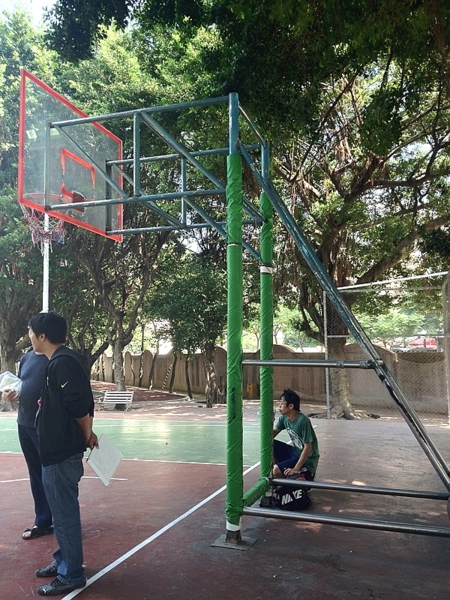 已更換單柱型籃框完成,並加裝保護軟墊