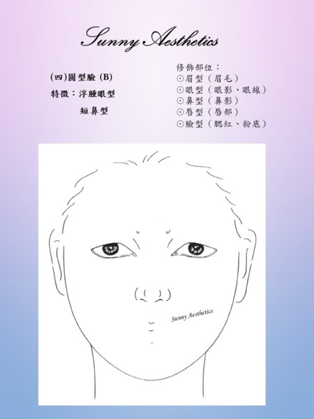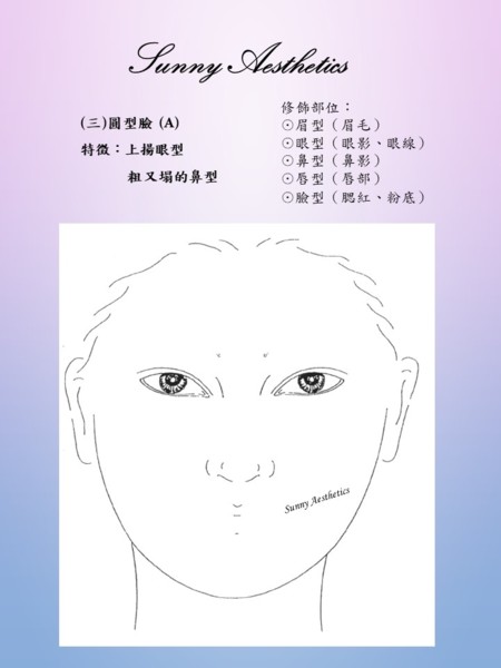 六、 此圖為圓型臉,其特徵為上揚眼型、粗又塌的鼻型。