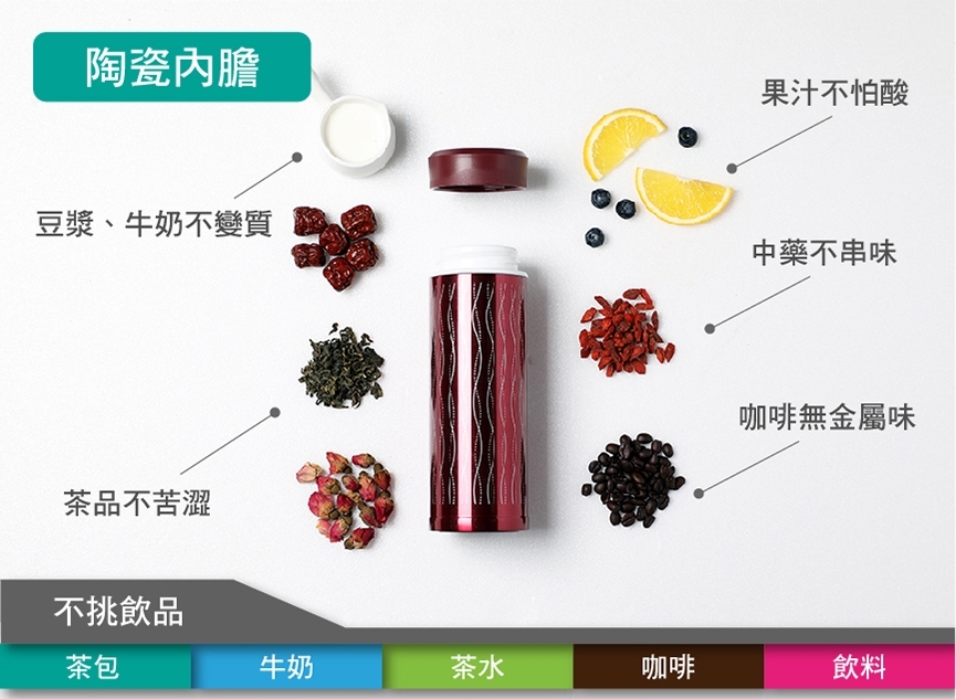 景德工藝陶瓷內膽 不怕金屬味br易潔陶瓷內膽 不卡汙不吃色br超真空保溫結構 冬天保熱夏天保冰