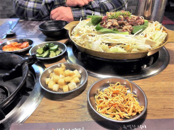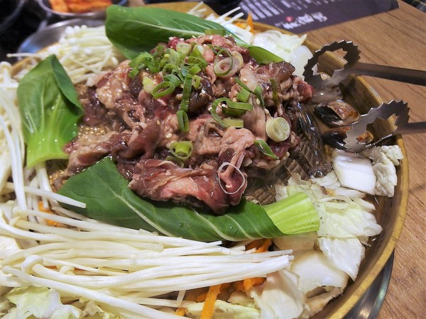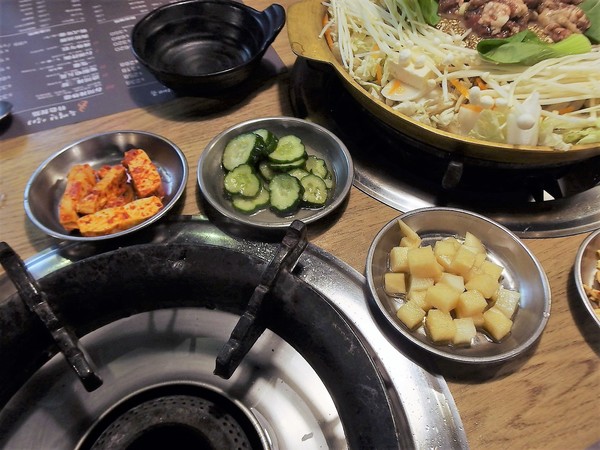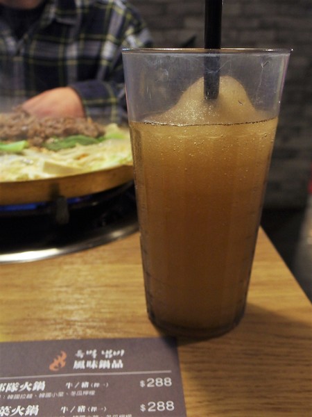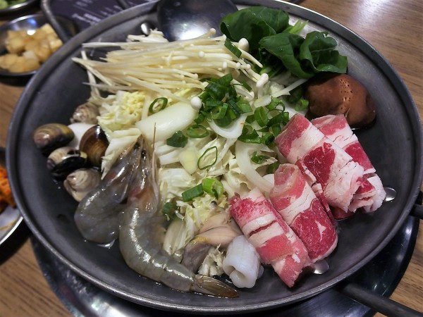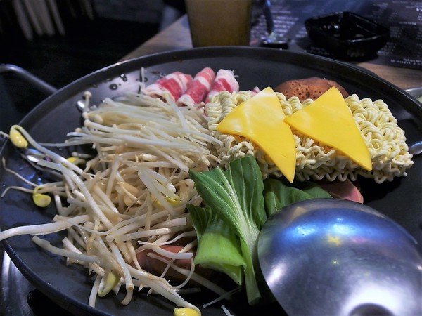 原則上,東西都算還不錯,不過份量對我家來說有點少,以銅盤烤肉來說,我一看那些份量,就不是我老公所能吃飽的份量。果然,他掃剛他的那一份之後,又嗑了女兒吃不下的部隊鍋,還把兒子海鮮鍋裡的青菜幫忙(?)吃掉……而兒子吃到最後,也問我能不能再添碗白飯?又叫了一碗讓他吃飽一點,然後配著部隊鍋的湯頭把飯吃完。