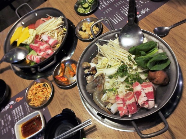 右下角是兒子點的海陸火鍋,左上角是女兒點的部隊火鍋。