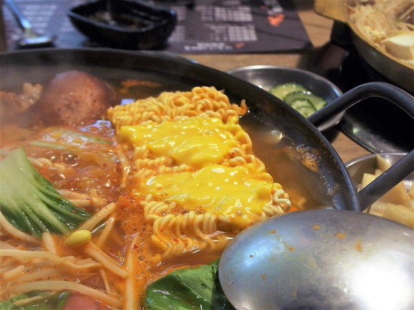 當起士在融化的時候,喔喔~~看起來真是超美味啊!其實也還滿好吃的。洛琳曾經在中原吃過一家韓式料理,每道菜的辣度都超過我能忍受的範圍很多,黃鶴洞的部隊火鍋裡的泡菜雖然也是辣的,但辣度低很多,這點我還滿意的。加上他們的小菜吃到飽,覺得還算划算。