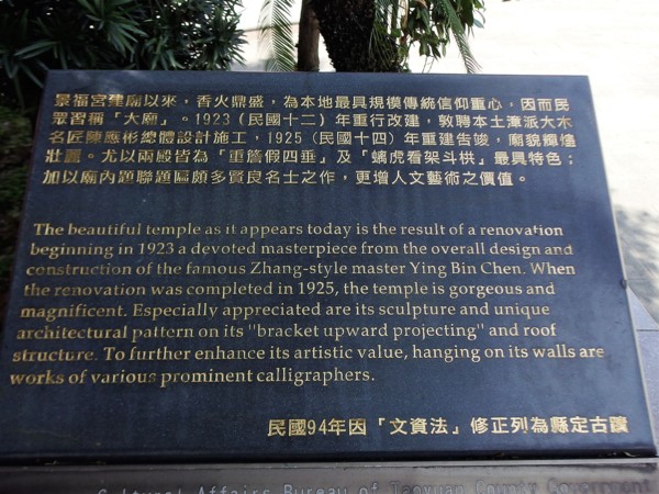 景福宮屬國家三級古蹟,是全台灣最大的木造開漳聖王廟,以前經過景福宮,對它沒什麼太大的研究,反倒是去河南一趟,突然覺得這廟宇建築倒是把中國文化傳下來最好的方式。這些照片,也就當為桃園地區的居民,作個記錄吧!