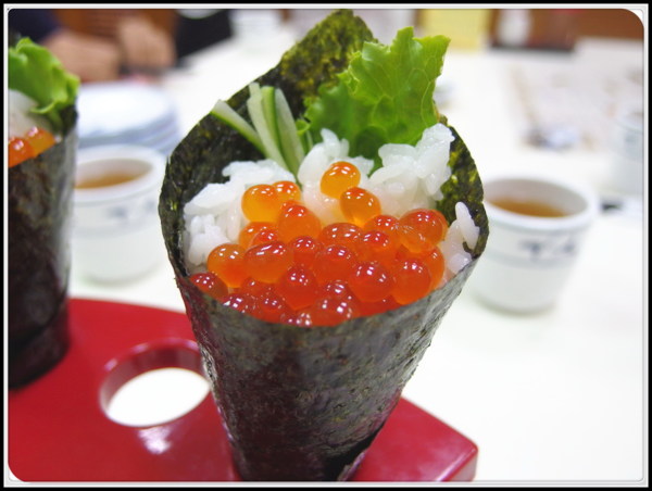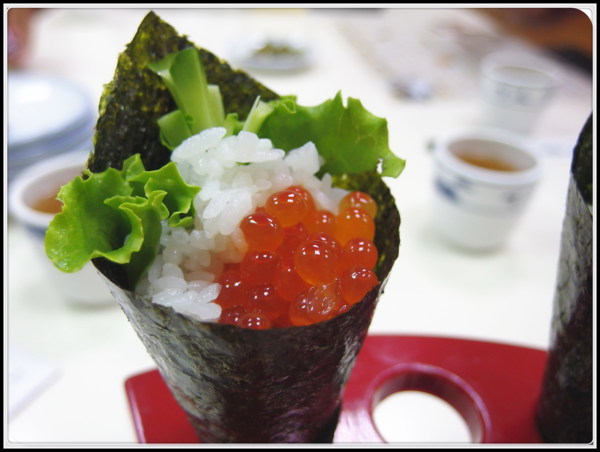 兒子點的鮭魚卵手捲,這傢伙倒是懂得吃好料的……瞧瞧這飽滿的鮭魚卵,看起來就令人食指大動,兒子很快就把兩份手捲吃光光!