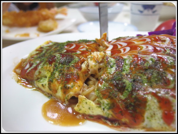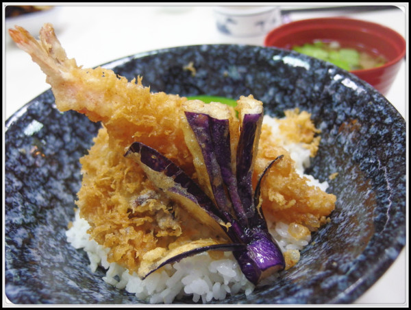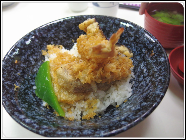 搶了兒子的炸蝦天婦羅後,才發現後來我的天婦羅飯也有隻炸蝦……啊!不管了,照吃不誤。天婦羅飯裡還有炸青菜,混上醬汁,吃起來比較夠味。吃到最後,飯會比較鹹,因為醬汁都沉到最底下了,下次有機會吃的話,要記得把飯攪拌攪拌。