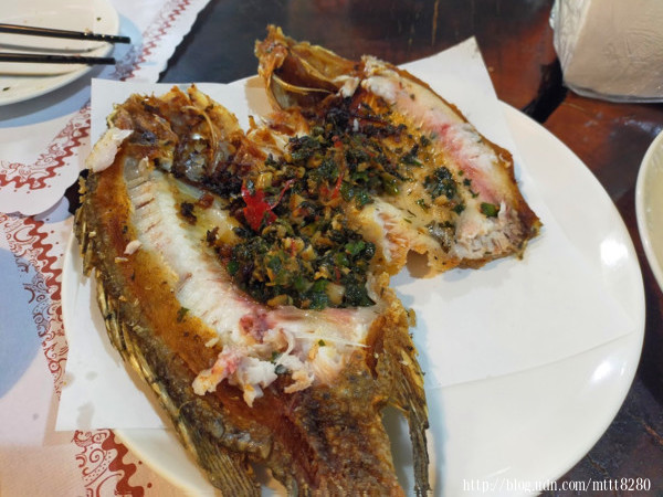 來了!來了!包料魚來了!外頭的魚肉炸得酥酥脆脆,魚身裡頭包的是多種香料,吃起來的味道就是不一樣!裡頭的員工對我有點印象XD~~畢竟前一晚才跟他們聊得十分熱絡,他們也跟我說明,他們這邊都有改良過,更貼近臺灣人口味。如果要吃道地的雲南菜,就去另外一間「魯媽媽」,但時間跟路線都不對,可以吃到這裡的包料魚就心滿意足,離開清境也無撼了~~