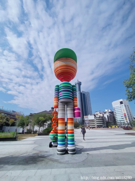 色澤繽紛……覺得很像彩虹人,不過,爬了一下資料,他是「期待旅行的男孩」,只見到他一手提著行李箱,另外一手拉著玩具車,象徵著人們的童心,就是一個想出去玩的男孩~~(為什麼我覺得像在說我?XDDDDDD