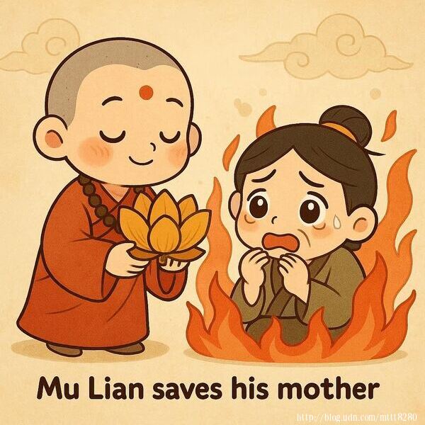 目蓮是佛陀的弟子,一次,他想看看去世後的媽媽,結果發現媽媽竟然在餓鬼道?這裡的鬼,不管吃什麼食物,食物就會化成火焰。為了救母,目蓮向佛陀求救,佛陀告訴他,在七月十五這天,供養僧眾,把功德迴向給母親,就可以離開餓鬼道。