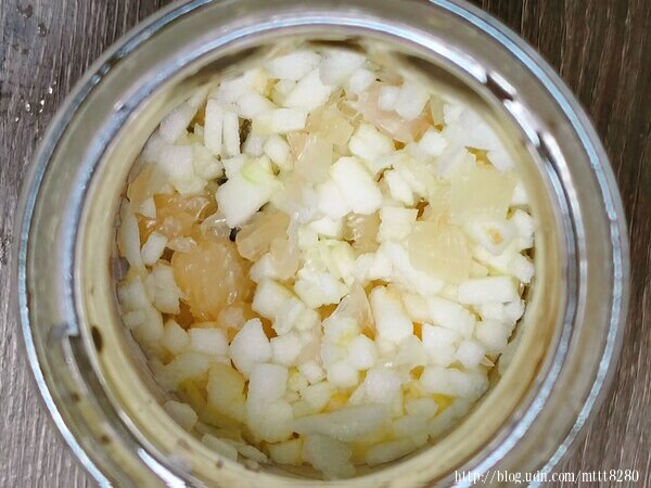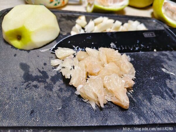 將柚子盡量剁碎……我剁剁剁剁剁剁……如果小孩小的話,我會剁更碎,但是現在大家都成人了,就大概0.3~0.5立方大小。