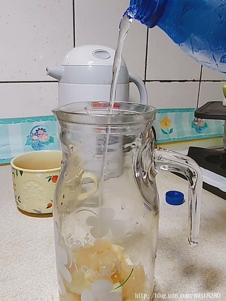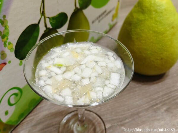 最後再倒入杯子裡,完成!我分別試了有糖跟無糖的氣泡水,因為氣泡水已經有點口感了,所以再加上柚子肉、蘋果丁,邊喝邊咬,吃著水果的清香已經足夠。如果想要再甜一點,可以加一點蜂蜜。
