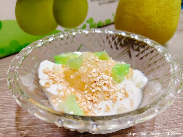 又另外買了優格,將剩下的柚子肉,以及家裡的麥片灑上去,上面綠綠的是芒果青,這樣吃起來感覺無負擔。看起來很養生~~