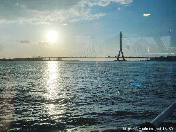 在遊艇上待了約三小時,準備回程,從河上看到岸邊的建築,燈光倒映在河面。
