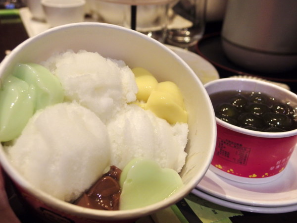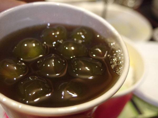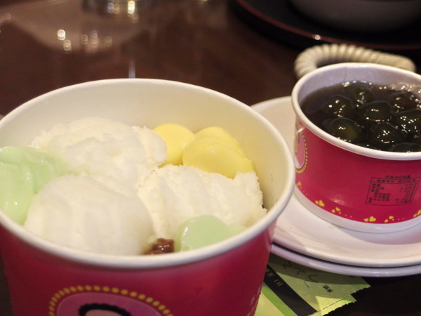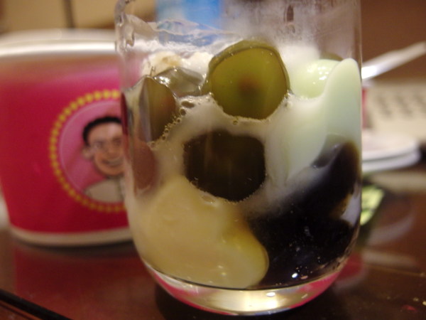 台灣每個角落,幾乎都吃得到粉圓,只是包心粉圓比一般珍珠大顆,中間則透著嚼勁,讓人在咀嚼的時候,感受到它的Q度,加上冰淇淋跟布丁,這道夏日消暑聖品,不吃嗎?嘿嘿!是說幹麼這麼搞怪,還把珍珠和布丁、冰放在杯子裡?因為我跟友人要SHARE嘛!不覺得放在玻璃杯裡的珍珠也滿美的嗎?