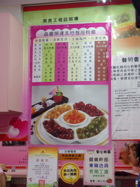 這一天住在美嘉美大飯店,晚上的時候,飯店借我們腳踏車,我們就騎出來逛大街,雖然知道宜蘭有很多吃的,但一時要找,還真不知道要吃什麼?我們騎了半天,都找不到適合的店,後來找了間滷味吃完之後,就來到這間晶圓包心粉圓了。店內採用粉紅色系,有甜蜜的滋味。不過我們討論了一下,決定帶回飯店吃。
