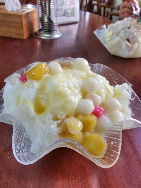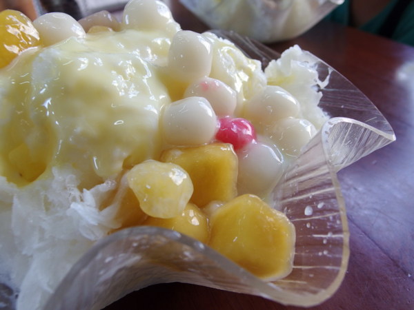 這是我的芋圓雪花冰……咦?湯圓?沒錯!為什麼會有湯圓我也不太清楚?會不會是芋圓不夠了,所以用湯圓來代替?我倒也沒去問,反正它錢不要算錯就好了。湯圓的口感可能是因為冰的關係,稍微硬了些,不過還是很好吃,稀哩呼嚕吃下肚。