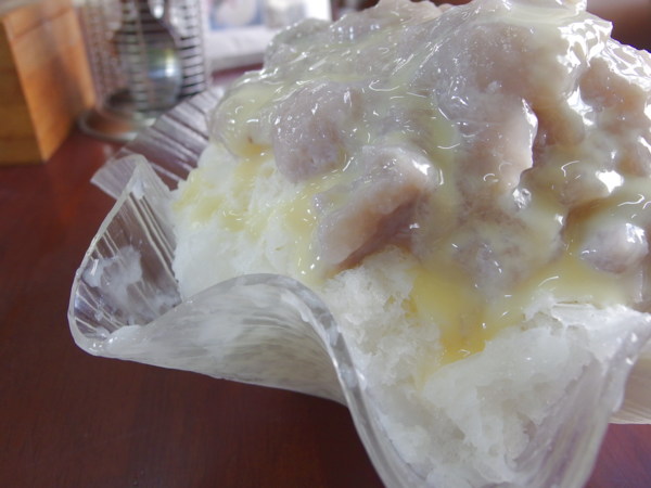 噹噹!芋頭雪花冰來囉!他們家的雪花冰本來就很好吃了,加上煮的綿綿的芋頭,雖然說這份是兒子的,不過我還是跟他說要分享,畢竟我的芋圓也有分他吃耶!