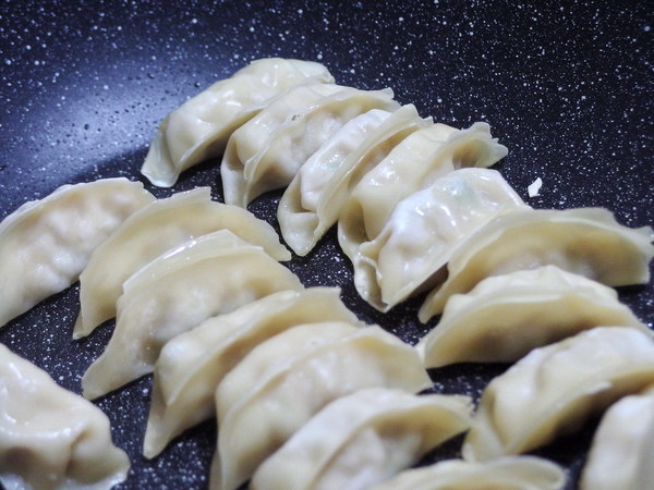 2.放進水餃,煎到微焦。(我都是用中、小火來煎,時間會花比較久,但比較可以煎出自己想要的焦度。熟練的人就可以自己調整火候及時間了。)