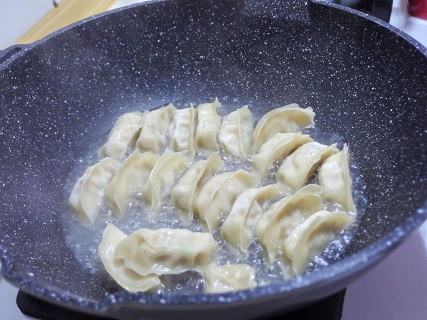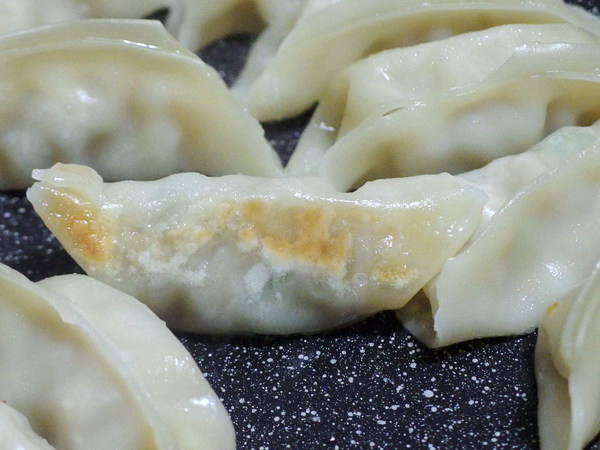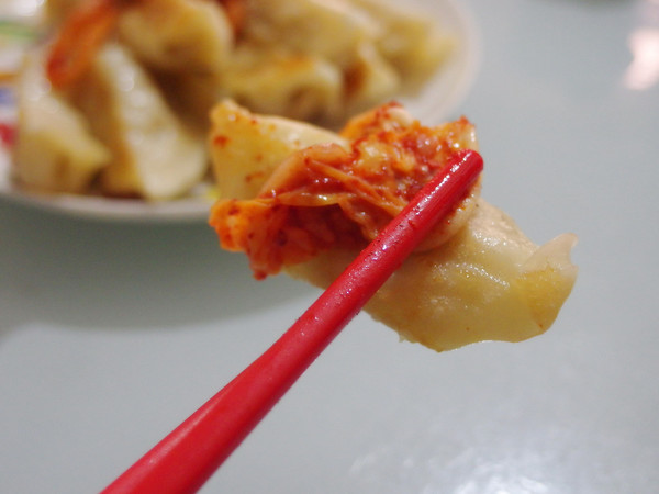 我覺得鍋具(鐵鍋或平底鍋)似乎也會影響到煎餃的作法,有興趣的人可能注意一下。這時候就可以一口泡菜、一口煎餃囉!我還會咬下一口煎餃,然後將泡菜塞進煎餃,再放進嘴裡。這道變化過的料理,讓對水餃興趣缺缺的兒子,一下子就可以將煎餃吃得精光!我也很喜歡這樣吃呢!