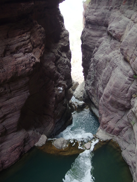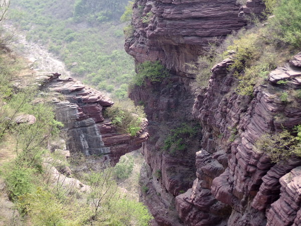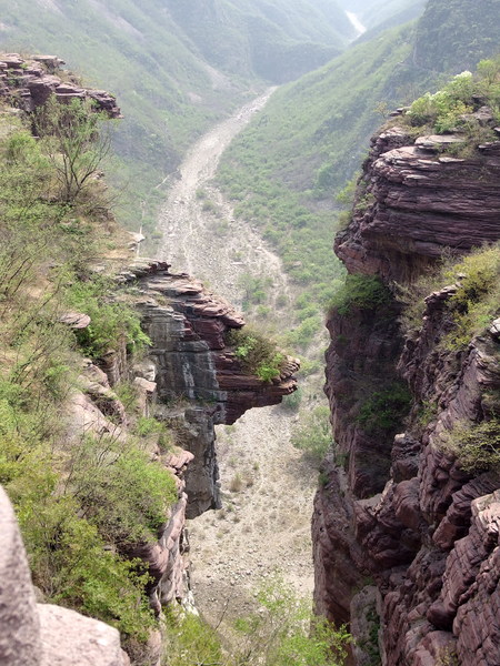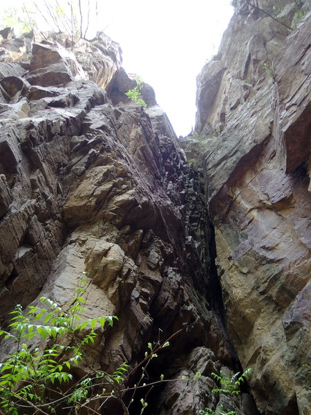 離開山洞後,漸漸的,來到了夾縫之處,這裡是兩片山壁最靠近的地方,由上往下看,萬分驚險,當地的人問我這裡跟太魯閣的感覺比起來怎麼樣?我笑笑回答,這裡險惡太多了,因為……在太魯閣的時候,我只有在車上,由上往下看,而在雲台山,可是腳踏實地,穿過山壁呀!