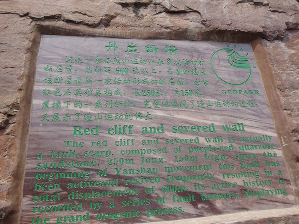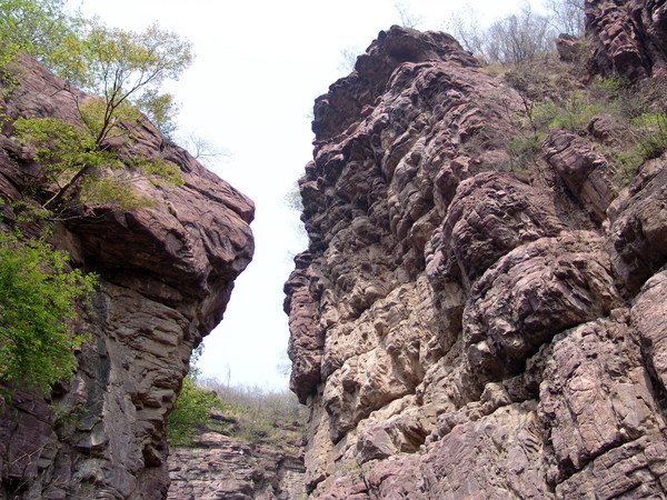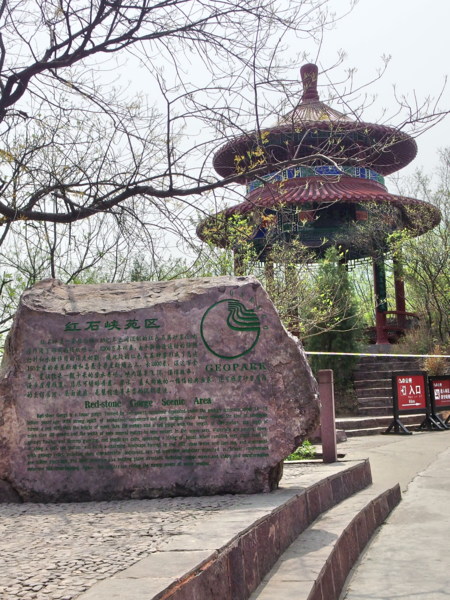 景區的石牌上面說明,紅石峽是紅色的石英砂岩,在地質作用下形成的。這裡就如同明代懷慶知府徐以貞寫詩道:「何年鬼斧劈層崖,鳥翼飛來一線間。」實際走過一遭,就可以明白徐以貞寫下這詩的意思,感覺紅石峽就像被天斧劈開似的,流水穿越,相當險峻。到底是誰在盛怒之下,劈了這山?