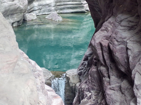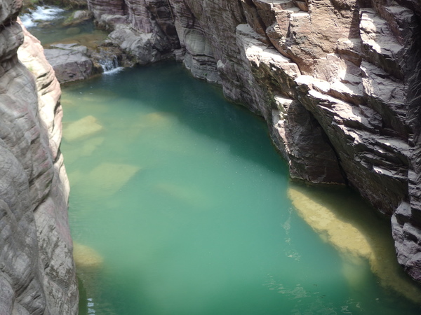 從山刃當中,由上往下看的感覺頗為震撼,如果不小心掉下去,那可不是好玩的……而這裡的水也清澈,裡頭的石頭相當分明,似乎可以踩進去……講講而已,水深可是看不出來的。焉知這露出水面的山壁,是不是只是一半?